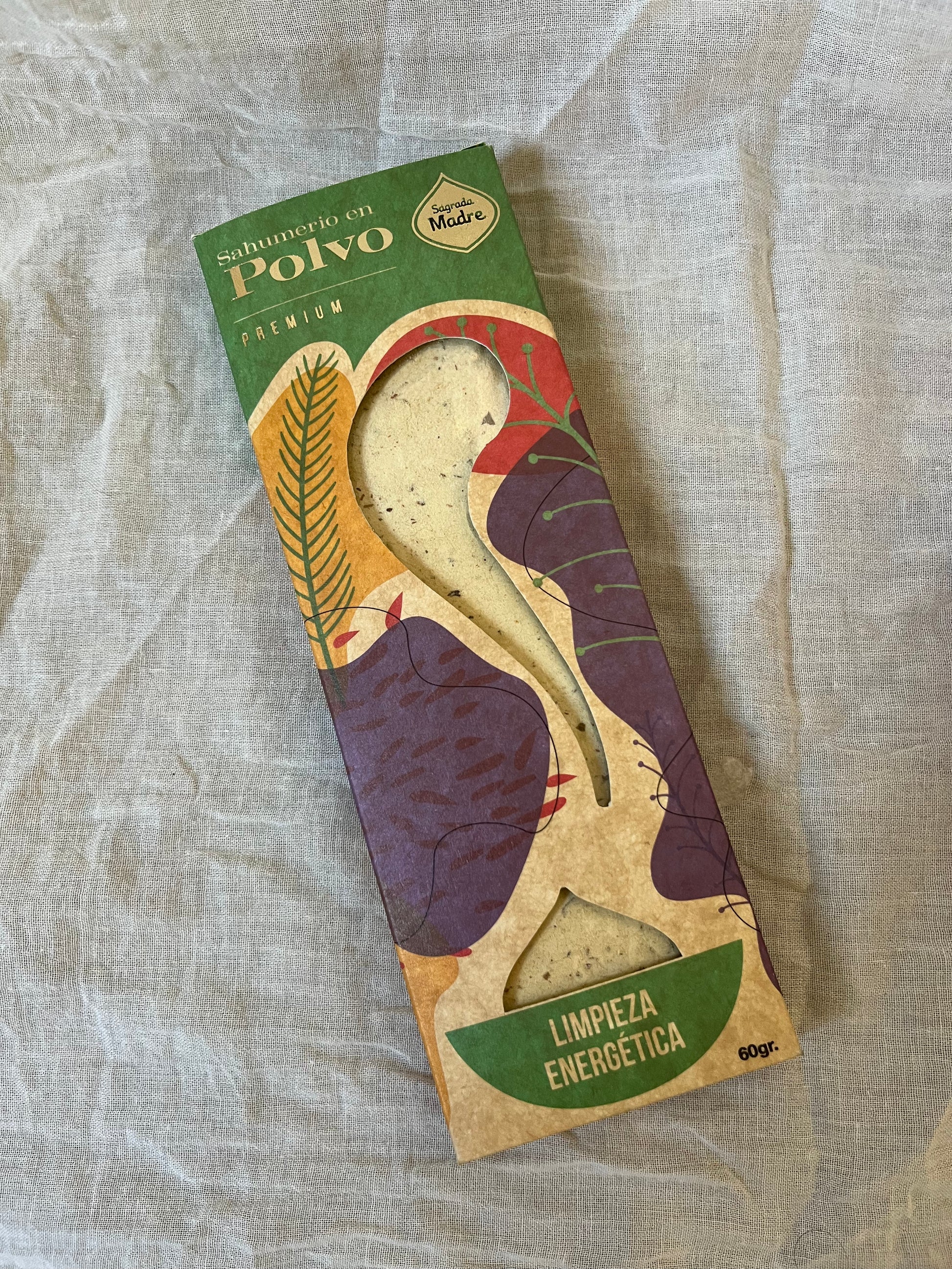 Incienso en polvo de Sagrada Madre. Hecho a base de aceites aromáticos concentrados, aceites esenciales, harina de madera, hierbas y sal.
