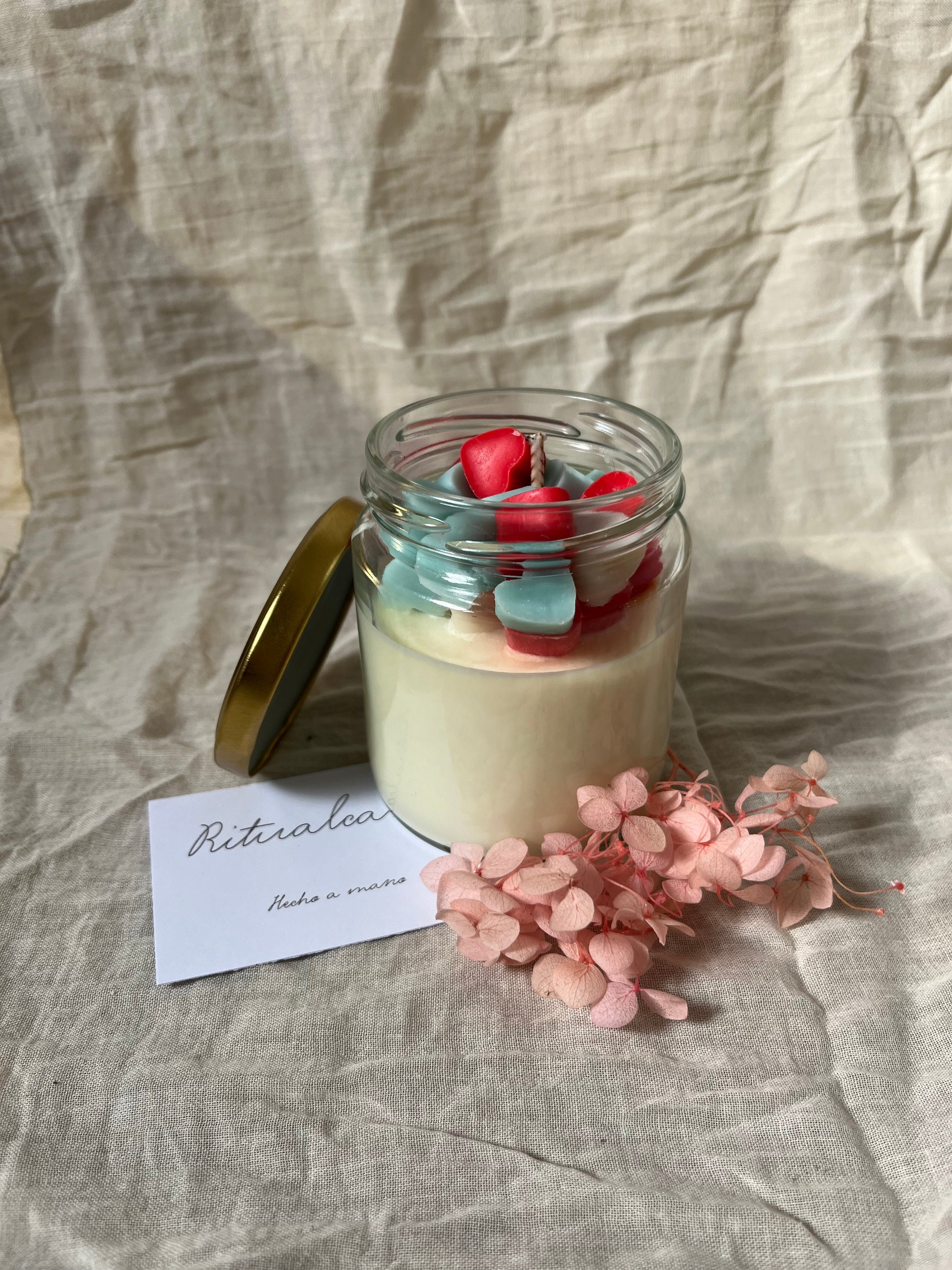 Vela aromática hecha artesanalmente con cera de soja 100% natural, no testado en animales y veganas.